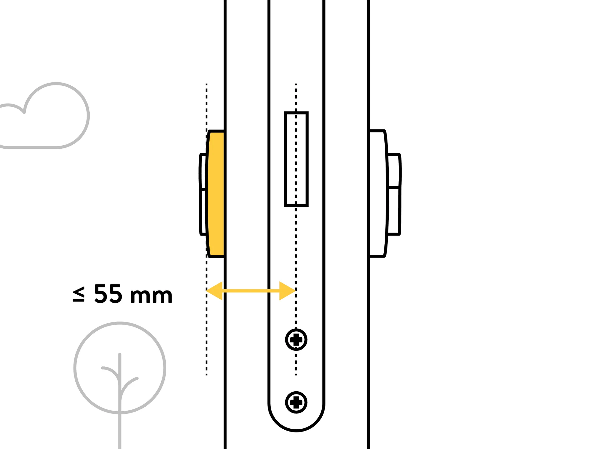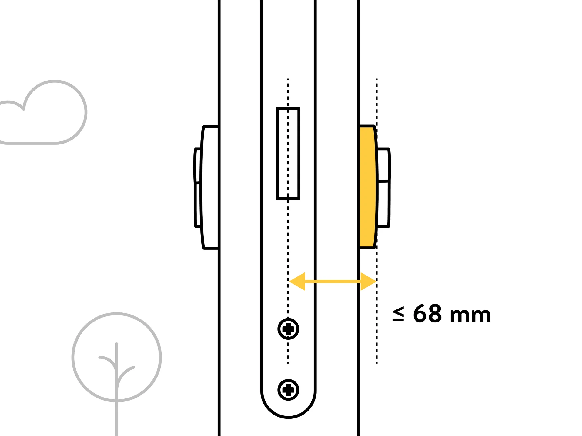 Votre porte s'ouvre-t-elle vers l'extérieur ? Alors la distance du centre du trou de serrure au cadre de la porte doit être supérieure à 40 mm, et la distance à la béquille doit être supérieure à 30 mm.